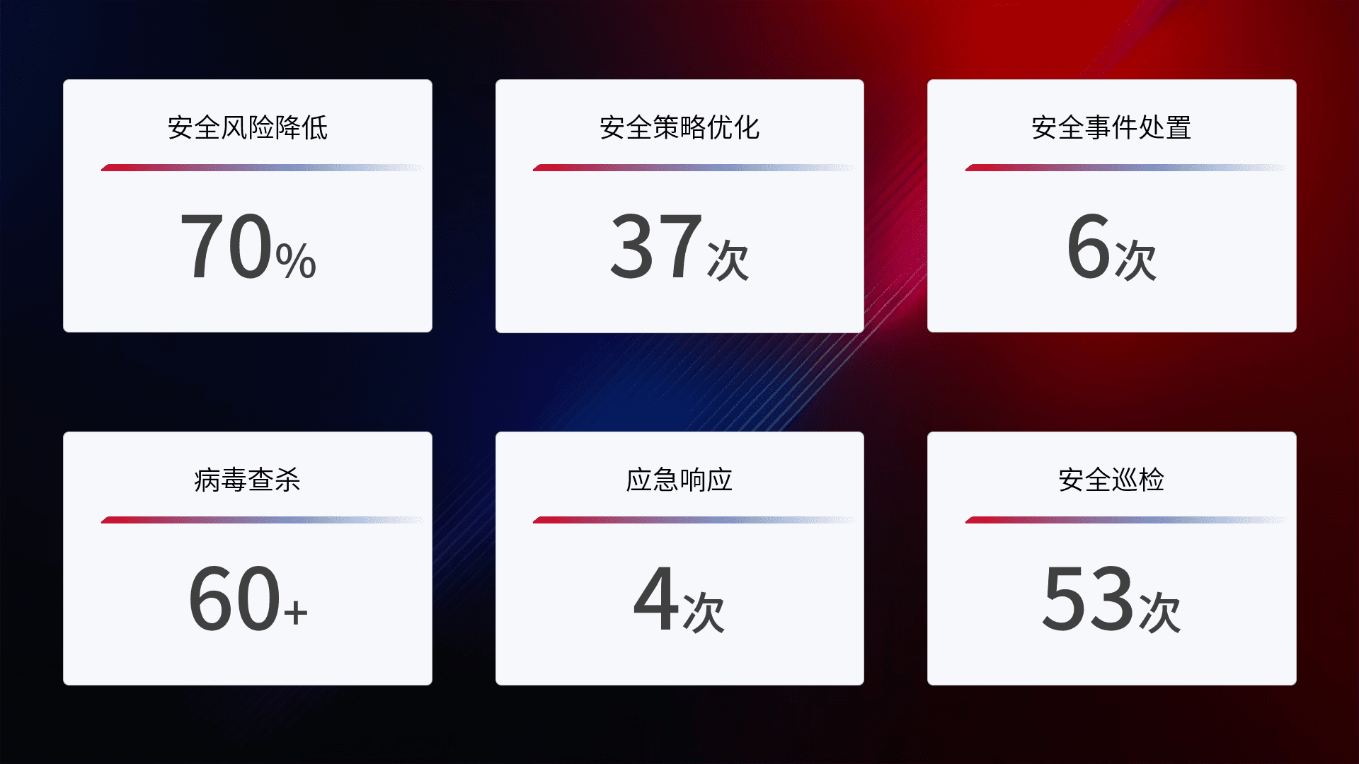 提供全面的安全事件报告体系,,包括处置报告、、周报、、、、季度和年度总结,,结合持续监控,,,,帮助客户深入了解网络安全状况。。。。