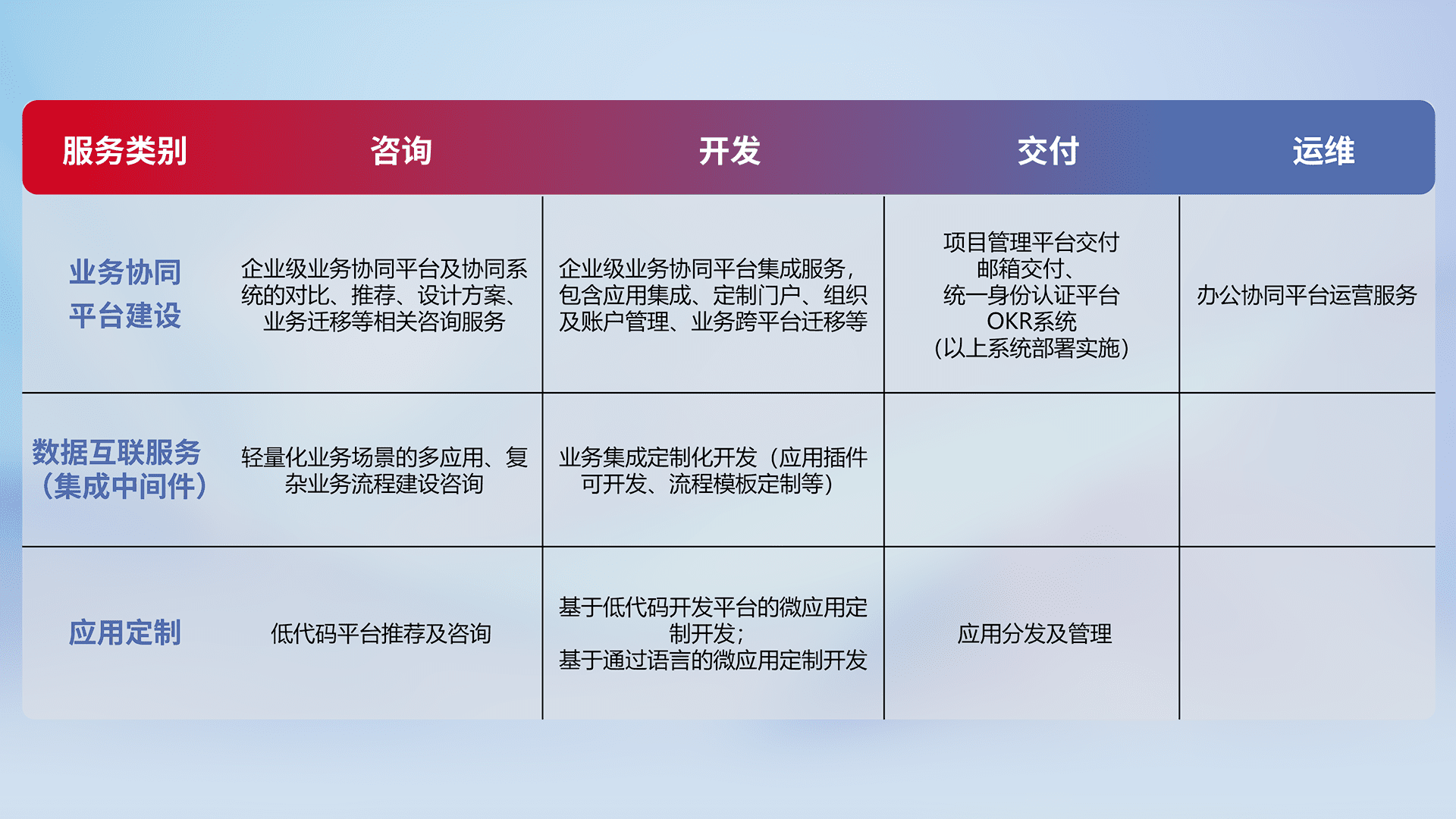 针对钉钉、、、企微、、、、IDaas等平台级产品提供产品的规划、、、、方案、、、交付、、定制化开发等服务,,实现如统一协同办公、、、、智能客户服务、、混合会议管理、、智能数据查询、、等业务场景,,,实现数字化转型。。。。